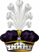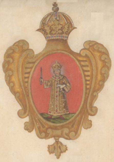 Княжеская шапка тёмно-малинового бархата с горностаевой опушкой, тремя видимыми золотыми дугами, усеянными жемчужинами, над которыми располагалась золотая держава с крестом;