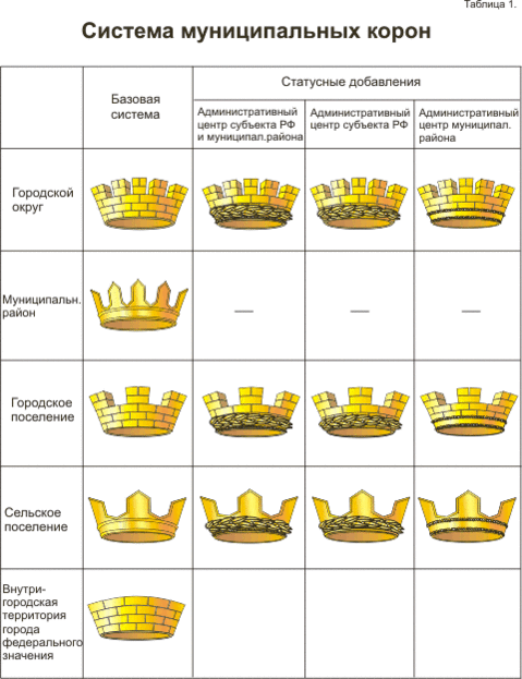 Первая система территориальных корон была разработана Геральдическим советом при Президенте Российской Федерации в 2002 году[21]. В настоящий момент действует система корон, утвержденная Геральдическим советом 24 марта 2005 года. Эта система заместила прежнюю, действовавшую в 2002—2005 и пересмотренную в связи с началом реформы системы местного самоуправления. Корона является официальным элементом герба, но она может включаться или не включаться в герб по усмотрению его хозяев (органов местного самоуправления); даже если корона включена в герб, геральдика допускает изображение герба в сокращённом виде — без короны[22]. Существует мнение, что данная система нуждается в кардинальном изменении[23]. Разногласия между местной властью и Геральдическим советом по поводу изображаемой на гербе короны могут служить причиной невнесения городского герба в Геральдический реестр, как, например, это случилось с гербом Томской области[24].