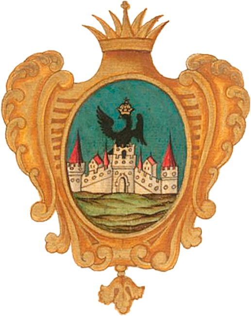 Во время следующего крупного пожалования гербов, в ходе административной реформы Екатерины II, гербы не содержали корон над щитом[17]. Характерная для территориальной геральдики централизованного государства задача ранжирования городов в соответствии с их административным статусом была решена помещением в верхнюю часть новосозданных гербов герба (либо его части) губернского города.