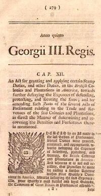 | An act for granting and applying certain stamp duties, and other duties, in the British colonies and plantations in America, towards further defraying the expenses of defending, protecting, and securing the same; and for amending such parts of the several acts of parliament relating to the trade and revenues of the said colonies and plantations, as direct the manner of determining and recovering the penalties and forfeitures therein mentioned. | |