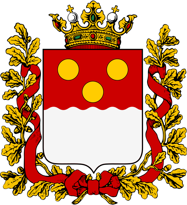 | Щит | четырехугольный, с закругленными нижними углами, заостренный в оконечности и пересечёный волнообразно геральдический щит |