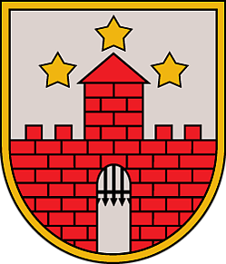 В серебряном поле червлёная мурованная стена с башней и открытыми воротами с поднятой чёрной решеткой. Над башней три пятиугольные золотые звезды. Кайма щита золотая[1][2].
