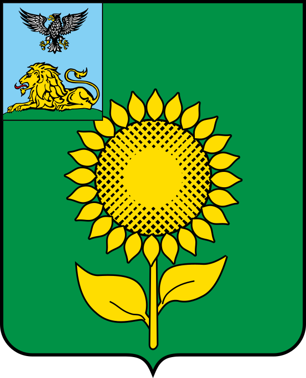 В зелёном поле золотой подсолнух. В вольной части — герб Белгородской области