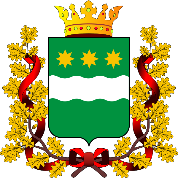 «В зеленом щите серебряный волнообразный пояс, сопровождаемый во главе щита тремя золотыми восьмилучевыми звездами. Щит увенчан древней короной и окружён золотыми дубовыми листьями, перевитыми красной лентой»