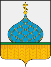 В серебряном поле на оконечности, выстланной золотыми колосьями и узко завершённой зеленью, — церковная главка, крытая ромбовидными лазоревыми листами с золотыми нитевидными краями и завершённая шестиконечным золотым крестом на таковом же шаре.