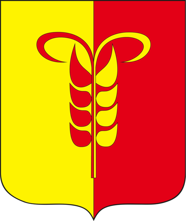 В рассечённом золото-червлёном щите — головка пшеничного колоса о восьми зёрнах в столб тех же переменных цветов, увершанная переменных цветов волютой.