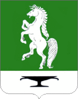 «В зелёном поле с серебряной обременённой чёрной чашей оконечностью серебряный восстающий конь».
