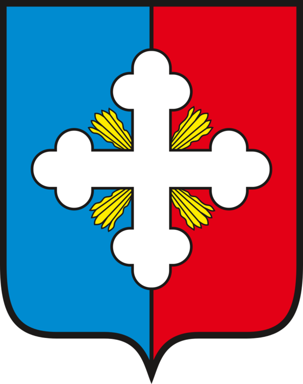 В рассечённом лазорево-червлёном щите — серебряный лапчатый крест с золотым сиянием, исходящим из перекрестья в четырёх направлениях.