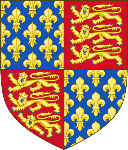 Во время Столетней войны, продолжавшейся с 1337 по 1453 год, и известной как Война леопарда против лилии, английский герб претерпел изменения. Когда французская королевская династия Капетингов пресеклась в 1328 году, среди претендентов на французский трон был и английский король из династии Плантагенетов Эдуард III (1312—1377). Когда королём избрали Филиппа VI Валуа, Эдуард III, в знак своих претензий на трон Франции, расчетверил поле щита, оставив во второй и третьей четвертях традиционных леопардов, а в первой и четвёртой поместил лазоревое поле, усыпанное золотыми лилиями — эмблему Франции. Он следовал геральдическому правилу, гласящему, что дети геральдической наследницы (женщины, имеющей родовой герб) могут в своём гербе поместить её герб вместе с гербом отца. Для этого они должны разделить щит герба на четыре части, изобразив в первой и четвёртой четвертях герб отца, а во второй и третьей — герб матери. В полном соответствии с правилами Эдуард должен был бы поместить леопардов в первую и четвёртую четверти щита, но отдал эту позицию лилиям, что в случае победы точнее отражало бы соотношение английской и французской частей его будущего объединённого королевства. Французские лилии оставались на британском гербе до 1800 года, когда упоминание Франции исчезло из королевского титула. Генрих IV (1367—1413) оставил на гербе только три лилии (этот символ называется «fleur-de-lis»).