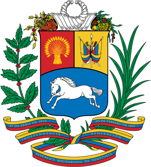 Над щитом — два скрещённых рога изобилия, извергающих богатство, представляют природные богатства Венесуэлы и её процветание. Щит обрамляют оливковая и пальмовая ветви, перевязанные лентой в цвета национального флага (жёлтый — изобилие нации, синий — океан, отделяющий Венесуэлу от Испании, алый — кровь и храбрость народа). Золотыми буквами на синей полосе нанесены следующие слова: