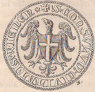 В конце XIII века появился крест, но первоначально не на печати, а на монетах. Цвета креста, серебряный на красном, не изменились с 1395 года[2].