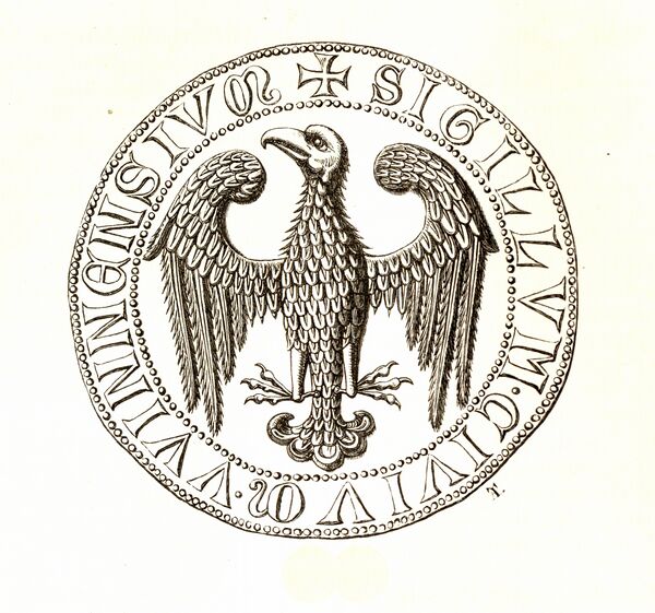 Первая комбинация орла с крестом появилась на печати 1327 года.