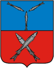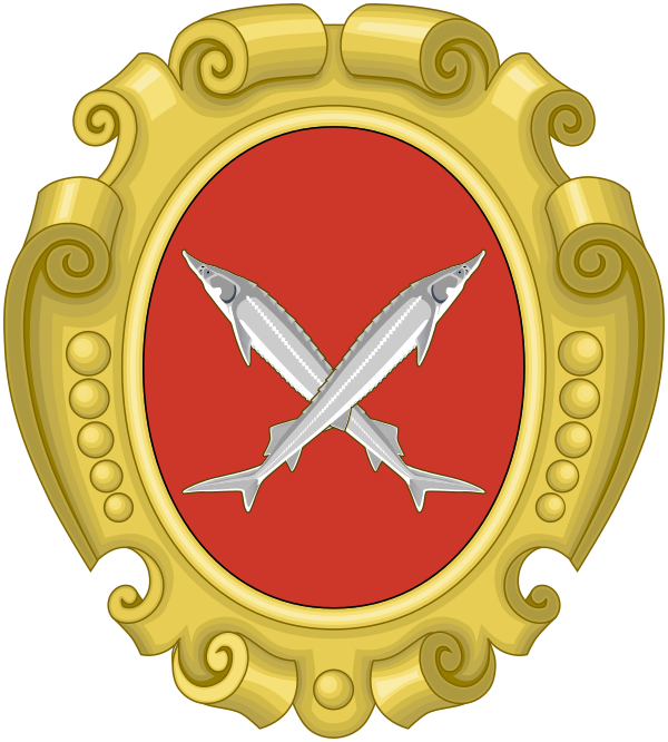 Два белые осетра, поле красное.