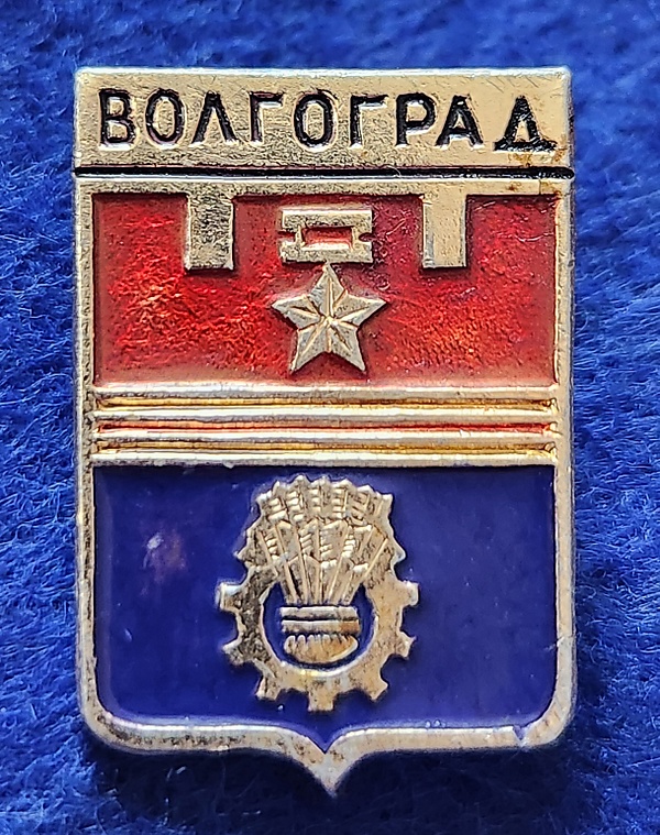 Общая форма герба города — героя Волгограда является традиционно-геральдической. В основу его взят щит золотистого цвета, разделенный на две половины лентой медали „За оборону Сталинграда“. Верхняя половина герба представляет собой символическое изображение неприступной крепости на Волге. Она представлена в виде зубцов крепостной стены, окрашенной в красный цвет. Красный цвет символизирует мужество, державность, кровь, пролитую за отечество, силу, энергию. Дополняет это Медаль «Золотая Звезда», которой награждён город, изображенная золотистым цветом на общем красном фоне. В нижней половине герба изображена золотистого цвета шестерня, символизирующая развитую промышленность и индустрию города, и золотистого цвета сноп пшеницы — символ изобилия волгоградской земли. Голубой цвет по всему полю в этой части герба символизирует Волгу. Соотношение ширины к высоте должно составлять 8:9. В таком виде герб существует по сегодняшний день.[2]
