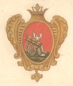 Прообразом этого герба послужила эмблематическая композиция № 43 из книги «Символы и эмблемата», изображающая орла, сидящего на стреляющем орудии, на фоне молний. Эмблема имела девиз: «Neutra timet» («Ни того ни другого не боится»)[8].
