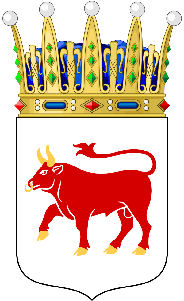 В серебряном поле червлёный бык с золотыми рогами, языком и копытами.