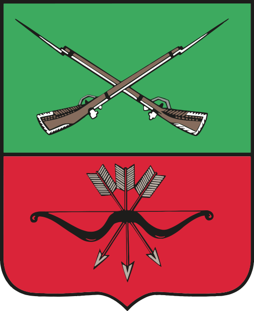 | Щит | Щит пересечён: в зелёном — два скрещенных опрокинутых кремневых ружья начала XVIII века с золотыми ложами и прикладами, серебряными стволами, замками, отделкой и штыками; в червлени — серебряный лук в пояс с тетивой вверх и, поверх него, три скрещенных опрокинутых серебряных стрелы |