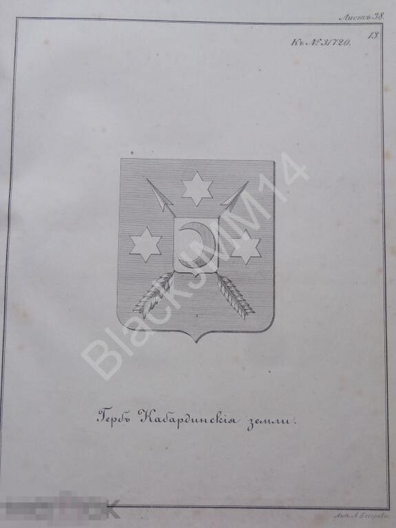 Старейшее изображение герба Кабарды содержится в Царском титулярнике 1672 года. Герб состоит из расположенного на белом поле червлёного (красного) щитка с обращённым вправо полумесяцем, находящегося поверх перекрещенных стрел, между ними — три шестиугольные звезды. В дальнейшем основная поверхность щита приобретёт синий (лазоревый) цвет, такой вид кабардинский герб имеет уже на грамотах Петра I. Цвет полумесяца, стрел и звёзд в то время варьировался от жёлтого (золотого) до белого (серебряного), также известны варианты с золотым щитком и червлёным полумесяцем. В «Историческом словаре российских государей…» И.Нехачина (1793 г.) и в проекте большого герба Российской империи 1800 г. герб Кабарды выглядит следующим образом: на лазоревом поле расположен перекрещённые серебряные стрелы, между которых расположены серебряные же шестиугольные звёзды, поверх них — красный щиток[1] с серебряным полумесяцем. В описании титульного кабардинского герба 1857 года щиток уже золотой с червлёным полумесяцем. Титульный герб Кабарды входил в состав герба Грузинского царства на большом гербе Российской империи.