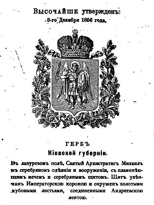 Герб Киевской губернии утвержден 8 декабря 1856 г. Описание герба: «В лазуревом поле святой Архистратиг Михаил в серебряном одеянии и вооружении, с пламенеющим мечем и серебряным щитом. Щит увенчан Императорскою короною и окружен золотыми дубовыми листьями, соединенными Андреевскою лентою»[4].