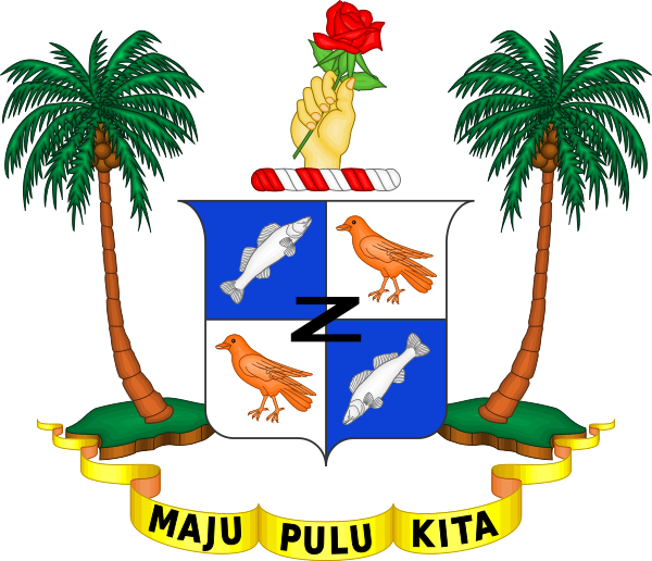 Щитодержателями выступают две пальмы. У основания герба расположен девиз островов «Maju pulu kita» (малайск. «Наш передовой остров»).
