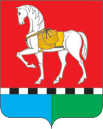 «В червлёном (красном) поле с рассечённой лазоревой (синей, голубой) и зелёной оконечностью, завершённой узкой составной серебряно-чёрной каймой — идущий серебряный конь с золотыми наперстью, подпругой и чепраком, несущий привязанные и свешивающиеся поверх чепрака два золотых круглых плетеных короба с крышками, один из которых больше».