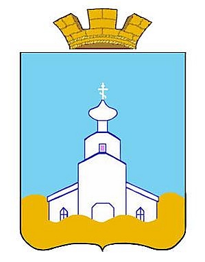 В лазоревом поле золотая волнистая оконечность с рождающимся серебряным православным храмом с высокой центральной частью в два яруса и с одной главкой и с двумя низкими односкатными боковыми пределами. Щит увенчан муниципальной короной установленного образца.