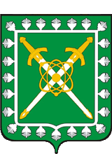 «В зелёном поле два золотых скрещенных меча в серебряных с отделкой первого металла ножнах. Окруженные тонкой серебряной внутренней каймой, украшенной снаружи таковыми же сосновыми шишками; поверх всего положен золотой знак атома: византин, окруженный тремя цикламорами и сопровождаемый тремя малыми византинами (2 и 1), лежащими на крайних точках цикламоров. Щит увенчан золотой муниципальной короной установленного образца».