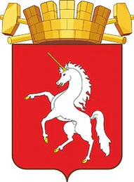 В червленом поле серебряный вздыбленный единорог с золотым рогом, языком, глазами и копытами.