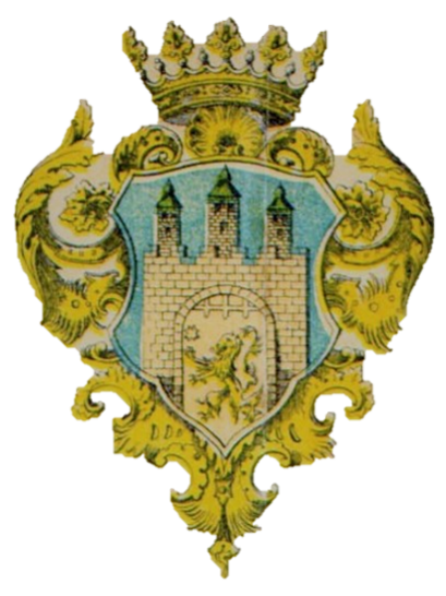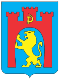 В лазуревом поле золотые с чёрной кладкой замковые врата о трёх башнях, из которых средняя выше боковых; каждая из башен о трёх зубцах и с чёрною бойницею; в вратах золотой леопардовый лев; (далее большой герб) щит увенчан серебряною городскою короною о трёх зубцах; по сторонам золотой коронованный лев и древнерусский воин в серебряном вооружении и червлёной приволоке; оба стоят на золотом карнизе, урашенном пересечённой на лазурь и золото лентой и золотым тризубом.