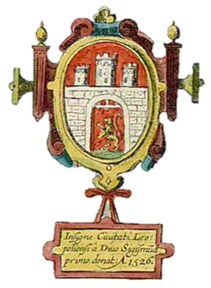 Старейшая городская печать прикреплена к пергаментной грамоте Львовского магистрата 1359. На ней изображение шагающего льва в открытых городских воротах с тремя зубчатыми башенками и бойницами. Изображение объединило символ названия (тождественный с именем сына основателя, Льва Романовича) и старинную эмблему княжества. В 1526. Польский король Сигизмунд I формально утвердил этот герб.