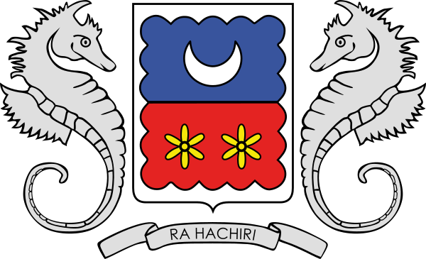 Герб представляет собой щит, пересечённый на лазурь и червлень, с выщербленной серебряной каймой, в лазури полумесяц того же металла рогами вверх, в червлени два золотых цветка иланг-иланга с серебряными сердцевинами; щит поддерживают два серебряных морских конька; внизу герба серебряная лента с начертанным чёрными литерами девизом «Ra Hachiri»[1].