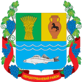 Описание: Щит полурассечен и пересечен зеленью, золотом и лазурью. В первой части золотой сноп, перевитый таковой же лентой. Во второй части терракотовая ваза, обремененная черным конем. В третьей части серебряная рыба, сопровождаемая сверху двумя нитяными выщербленными серебряными поясами. Щит обрамлен венком из виноградных гроздьев, перевитыми красной лентой с надписью "Першотравневий район".