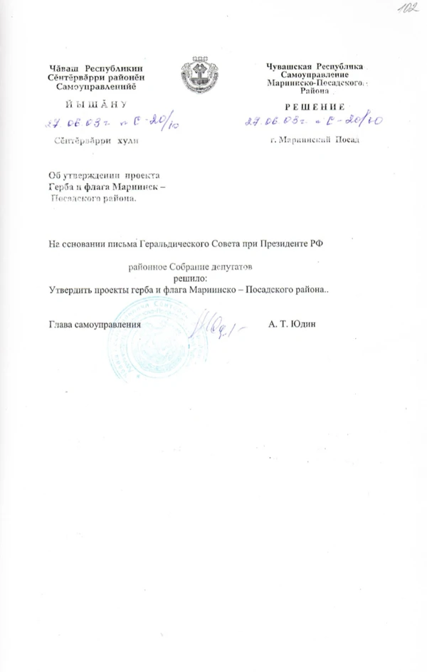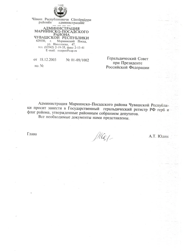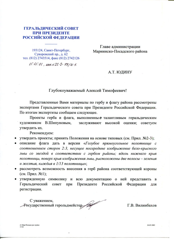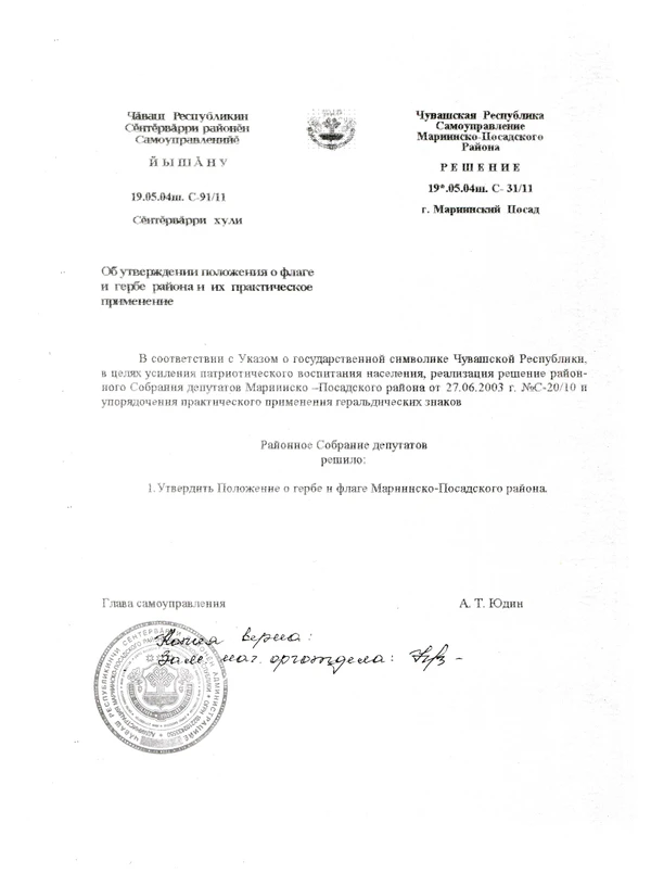 26 мая 2003 года Государственный герольдмейстер Г.В. Вилинбахов направил в администрацию Мариинско-Посадского района экспертное заключение по проектам символики района с рекомендацией утвердить проекты.
