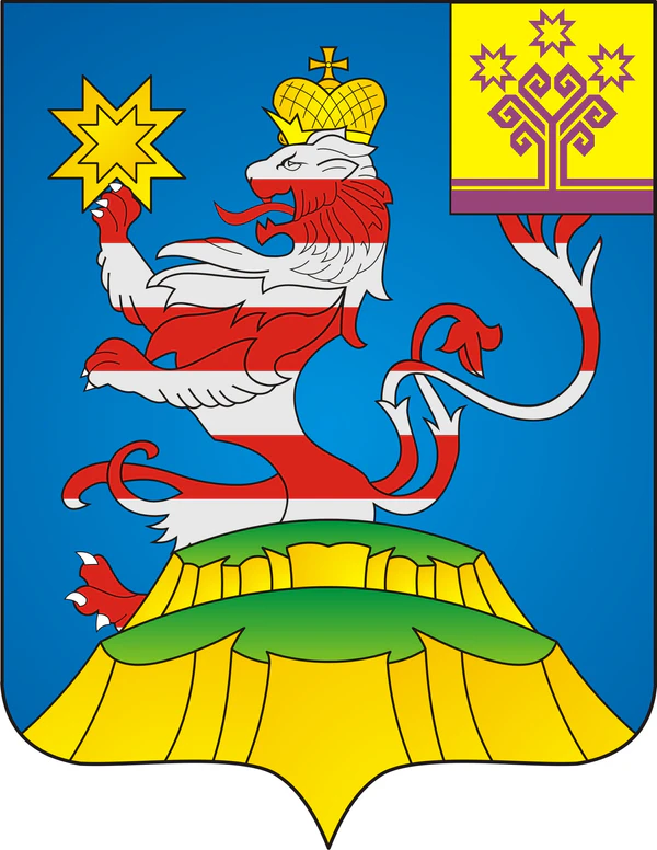 В лазоревом (синем, голубом) поле семикратно пересеченный серебряный и червленый двухвостый лев с серебряными когтями, коронованный золотой малой Императорской короной и несущий в правой передней лапе золотую осьмиконечную, обращенную двумя лучами вверх, звезду и поверх всего в оконечности две золотые горы с зелеными вершинами, стоящими одна позади другой. В левой вольной части — законодательно установленная символика Чувашской Республики[5][6][7].