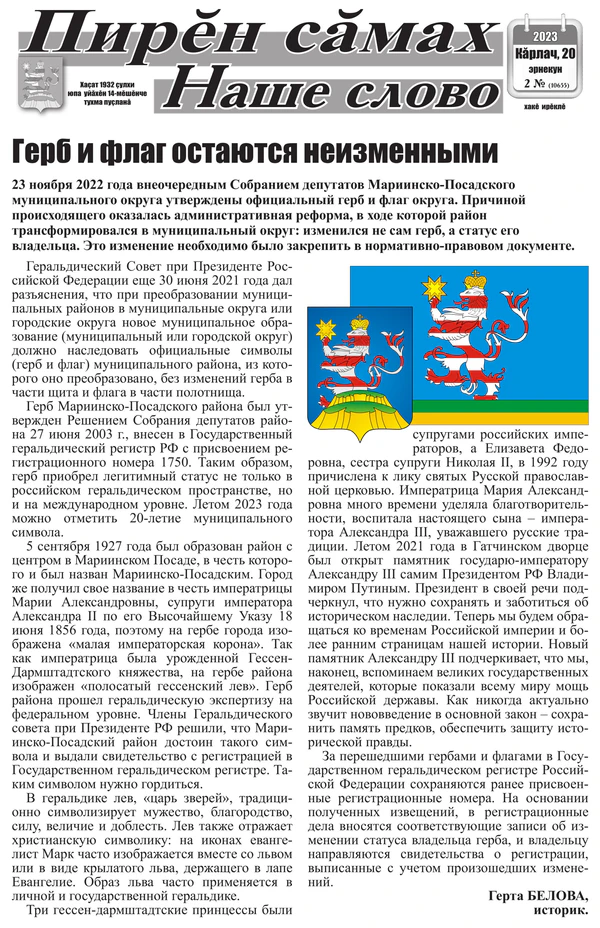 В 2022 году Мариинско-Посадский муниципальный район со всеми входящими в его состав муниципальными образованиями преобразован в Мариинско-Посадский муниципальный округ с сохранением символики.