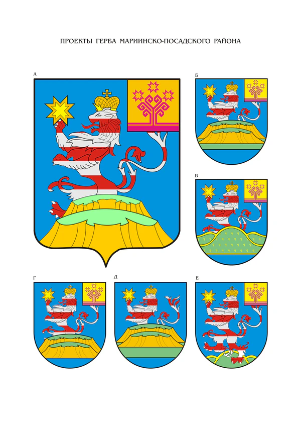 Необходимым символом герба Мариинско-Посадского района является Гессенский лев, так как Императрица Мария Александровна — дочь Людовика Второго, великого герцога Гессен-Дармштадтского, что является достаточным основанием для внесения в герб полосатого льва, коронованного малой Императорской короной и несущего в правой передней лапе путеводную звезду, которая символизирует район, как родину третьего космонавта СССР А. Г. Николаева[8].