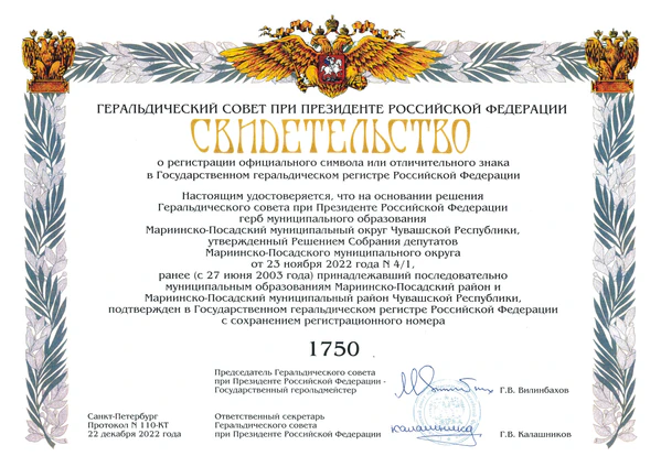 28 декабря 2004 года герб Мариинско-Посадского района внесён в Государственный геральдический регистр Российской Федерации — № 1750[11].