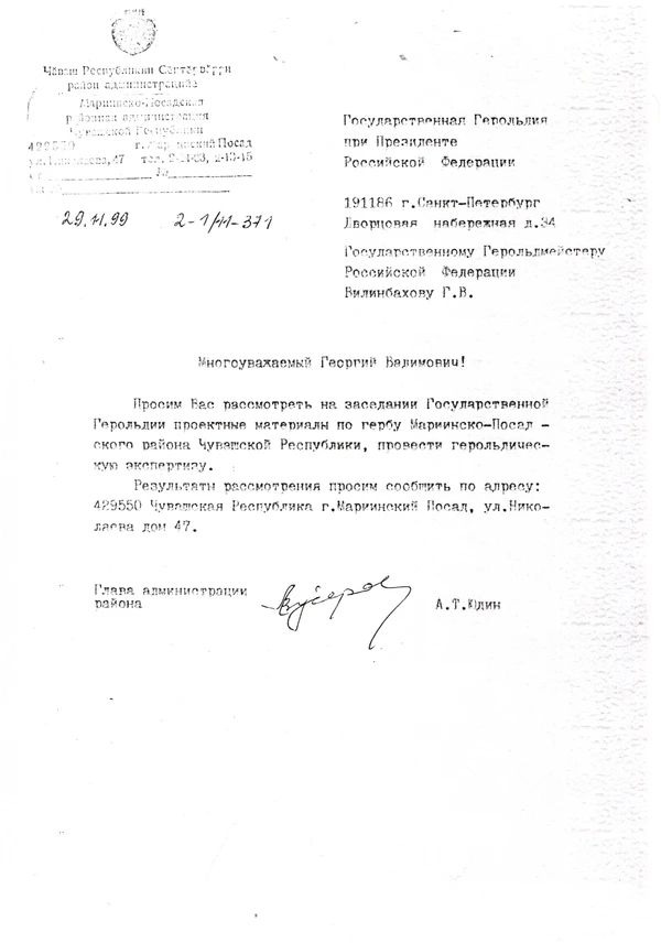 29 ноября 1999 года администрация Мариинско-Посадского района направила письмо в Государственную Герольдию при Президенте Российской Федерации с просьбой рассмотреть проектные материалы по гербу района и провести геральдическую экспертизу.