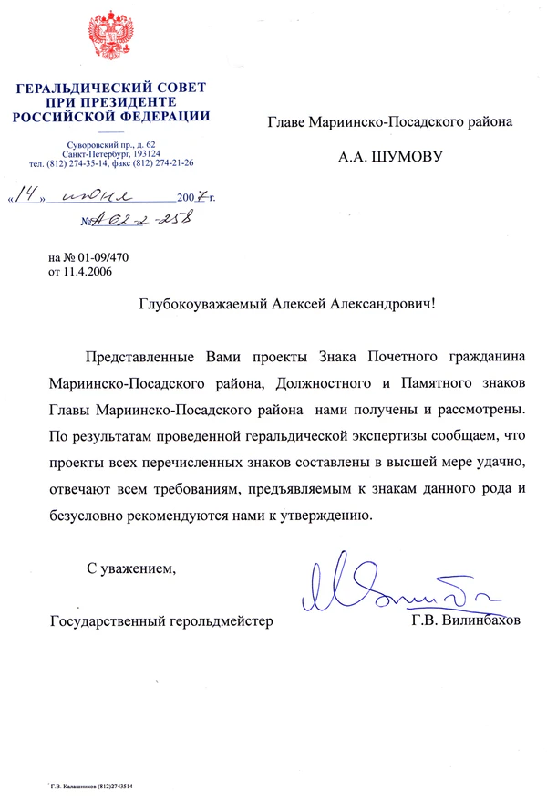 Проекты Знака Почётного гражданина Мариинско-Посадского района, Должностного и Памятного знака главы Мариинско-Посадского района прошли экспертизу в Геральдическом совете при Президенте Российской Федерации[9].