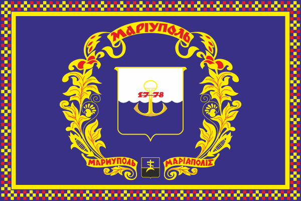 На флаге Мариуполя 1994 года использовались два варианта герба — 1989 года (расположен по центру) и 1811 года (внизу полотнища). Автор флага/знамени — Е. В. Харабет.