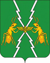 В зелёном поле два выходящих сверху и снизу дважды зазубренных узких серебряных стропила, соприкасающихся вершинами в центре щита, поверх всего железнодорожное крылатое золотое колесо, придерживаемое за крылья двумя стоящими на четырёх лапах сообращёнными золотыми муравьями с червлёными глазами.