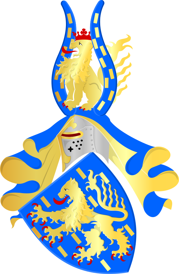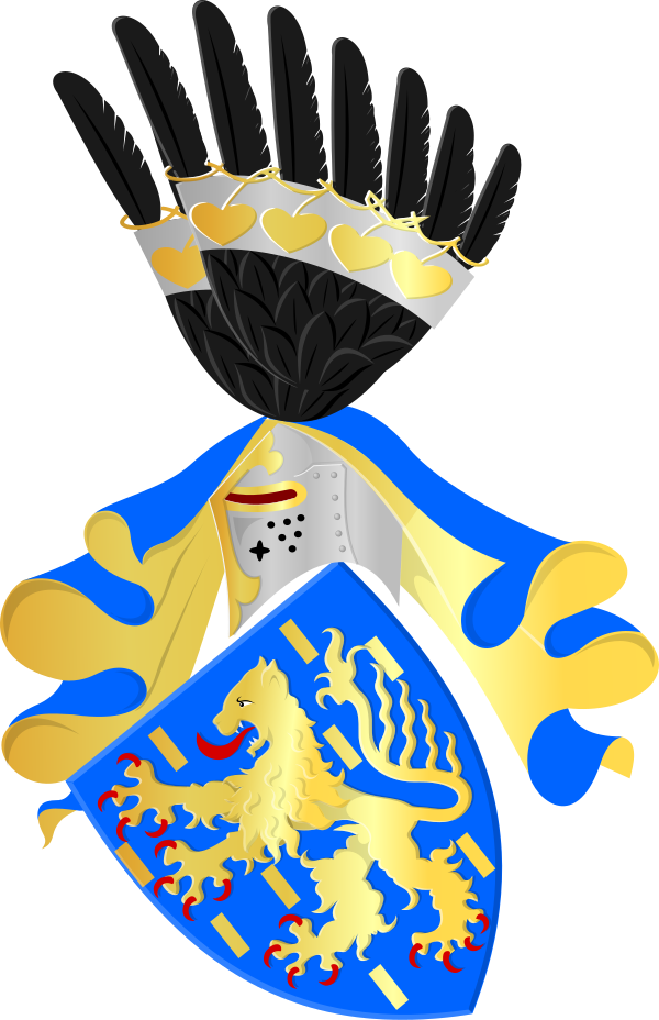 Нашлемник вальрамской линии: «Между двух лазурных рогов с золотыми билетами сидит золотой лев». На полном гербе Великого герцога Люксембурга этот лев с червлёными короной, когтями и языком.