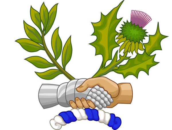 Две руки, одна обнажённая, а другая в доспехах, держат чертополох, символизирующий Шотландию, и благородный лавр, символизирующий мир[9].