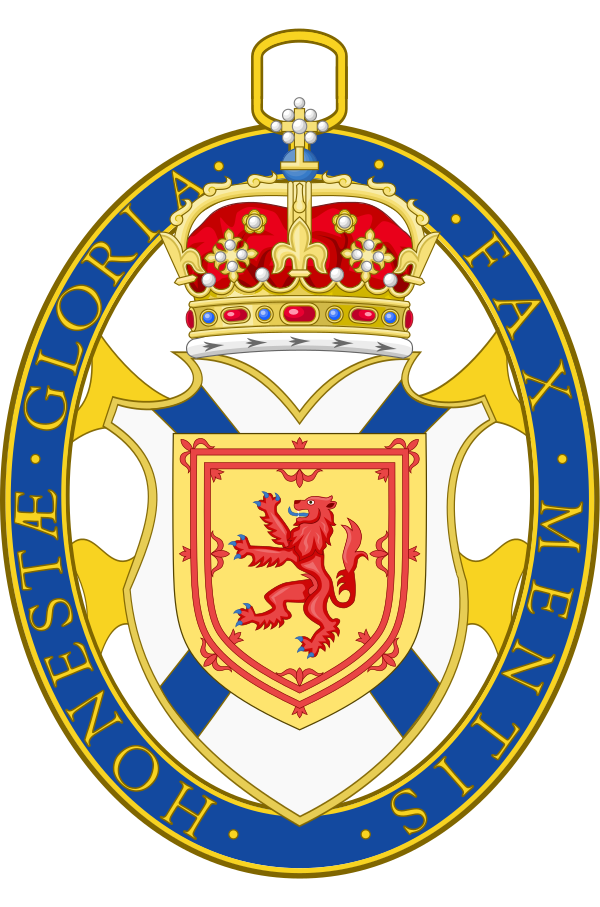 Щит несёт синий Андреевский крест на белом поле. На нём также изображён щиток с королевским гербом Шотландии: золотой щит со стоящим на задних лапах красным львом в двойной кайме, украшенной геральдическими лилиями.
