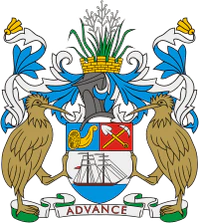 Щит треугольный. В первой части в лазоревом поле рог изобилия. Во второй части в червлёном поле лопата и кирка, положенные в андреевский крест. В третьей части на серебряном поле над морскими волнами двухмачтовый корабль при полных парусах и флагах, плывущий влево. Щит украшен городской короной с цветками новозеландского льна. Щитодержатели — киви по обеим сторонам. Девиз: «Advance»[2].