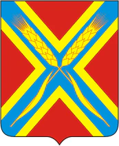 В червлёном поле окаймлённый золотом лазоревый косвенный крест, обременённый соединёнными в такой же крест двумя золотыми колосьями