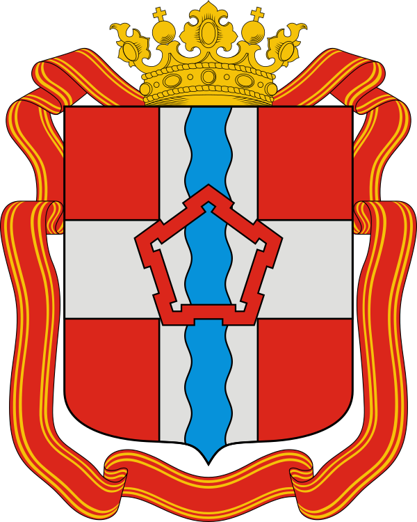 В червленом поле серебряный крест, обремененный узким волнистым лазоревым столбом, поверх которого в средокрестии — червленым контуром крепость о пяти бастионах, одним бастионом вверх. Щит увенчан древней царской короной и окружен лентой ордена Ленина.