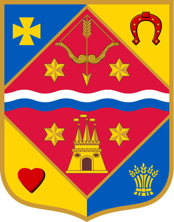 - Сноп — олицетворяет природное богатство, плодородие земель, трудолюбие её жителей, национальные традиции края.