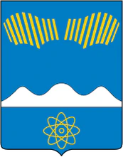 В лазоревом поле три горы (средняя выше), сопровожденные вверху многочисленными отвлеченными лучами северного сияния разной длины, направленными наискось вправо и влево; внизу – диском ядра атома, окруженным четырьмя эллиптическими орбитами электронов. Горы серебряные, все остальные фигуры и окантовка герба - золотые
