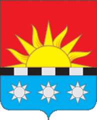 «В червлёном поле, с голубой оконечностью обременённой тремя серебряными восьмиконечными звёздами и завершённой узким поясом, скомпонованным из черных и серебряных частей; выходящее золотое солнце (без изображения лица)».